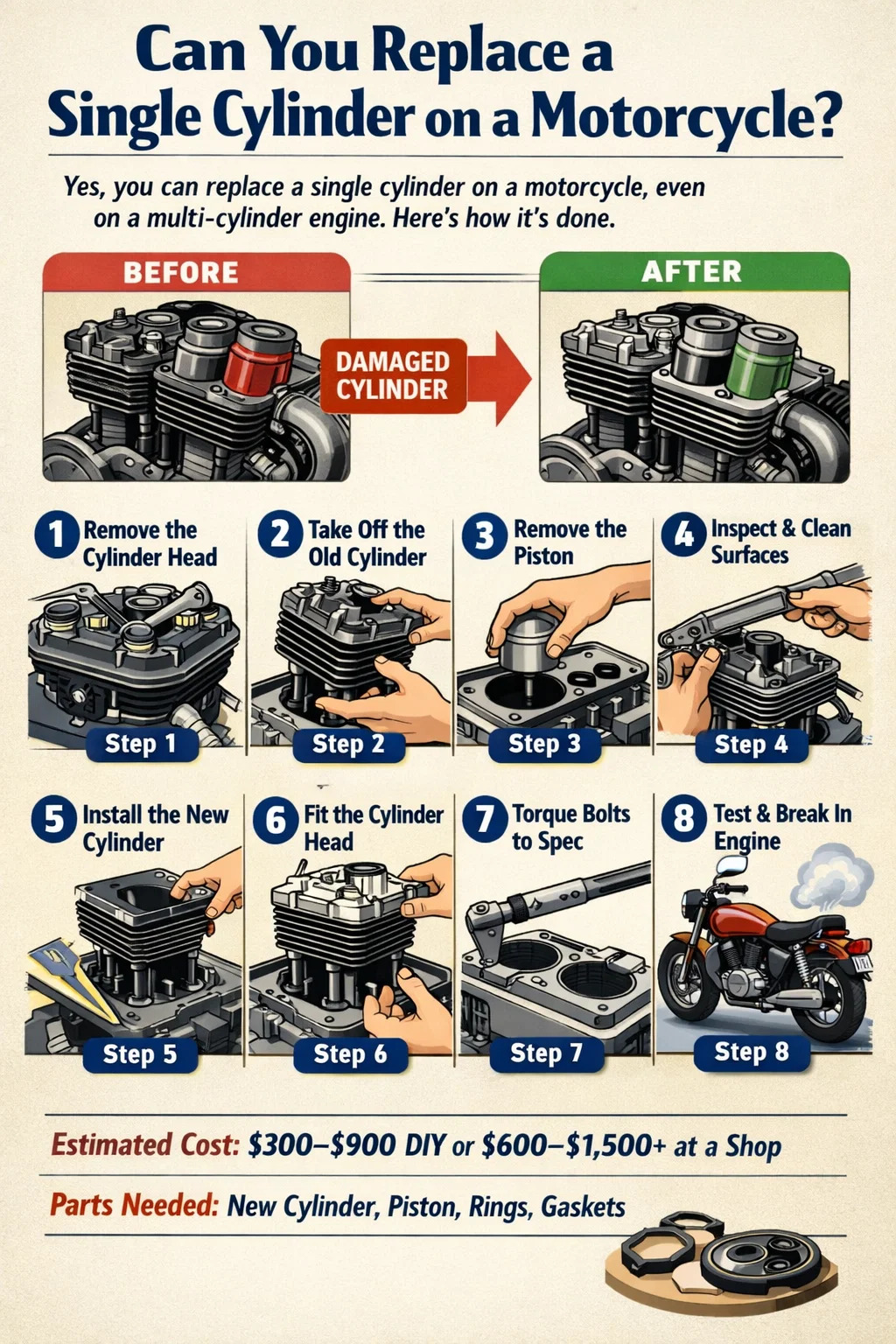 Det korta svaret är ja - du kan byta ut en enstaka motorcykelcylinder, och speciellt för encylindriga cyklar är detta ett av de mer enkla motorjobben som en erfaren hemmekaniker eller butik kan ta sig an. Oavsett om du har att göra med en sprucken borrning, en sprucken pipa eller hårt slitage som honing inte längre kan fixa, är att byta ut cylindern en väletablerad reparationsväg. På flercylindriga motorcyklar gäller samma princip: enskilda cylindrar kan bytas ut utan att dra eller bygga om hela motorn, även om komplexiteten ökar med antalet inblandade cylindrar.