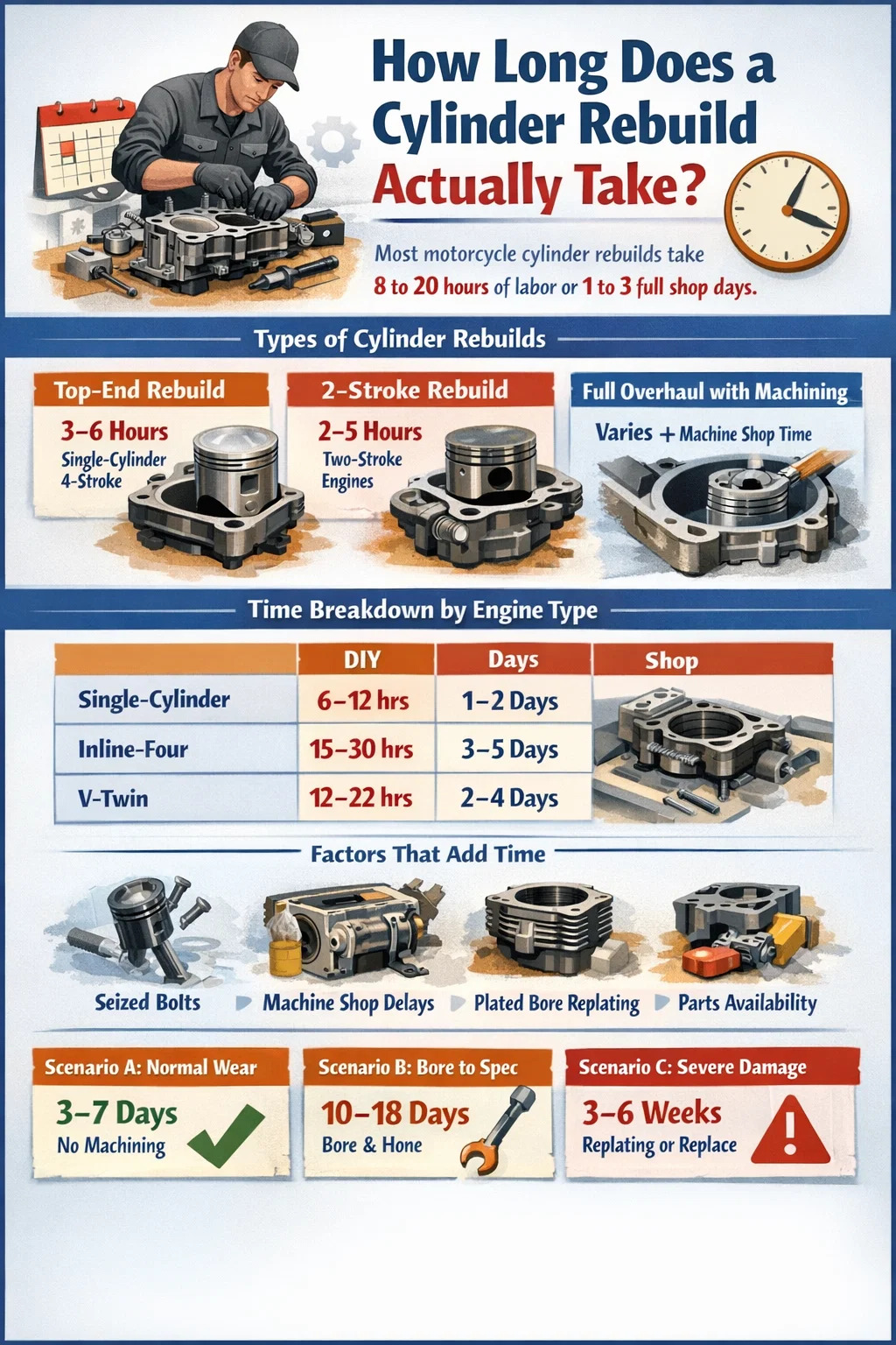 För de flesta motorcykel cylinder ombyggnader bör du planera för 8 till 20 timmars arbete om du gör jobbet själv, eller ungefär 1 till 3 hela butiksdagar om jobbet lämnas till en professionell mekaniker. Det intervallet är brett med avsikt - den faktiska tiden beror mycket på motortypen, cylinderns tillstånd, om maskinverkstadsarbete behövs och reservdelstillgänglighet.